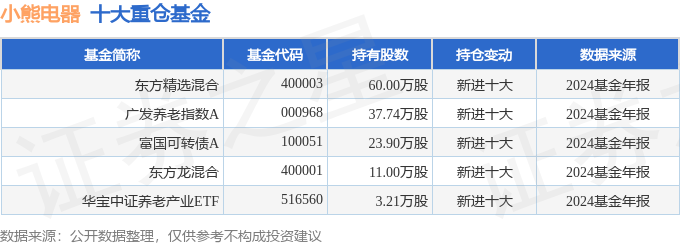 持有小熊电器最多的基金为东方精选混合,目前规模为8.91亿元,最新净值1.5331(4月9日),较上一交易日上涨1.17%,近一年下跌6.58%。该基金现任基金经理为许文波。